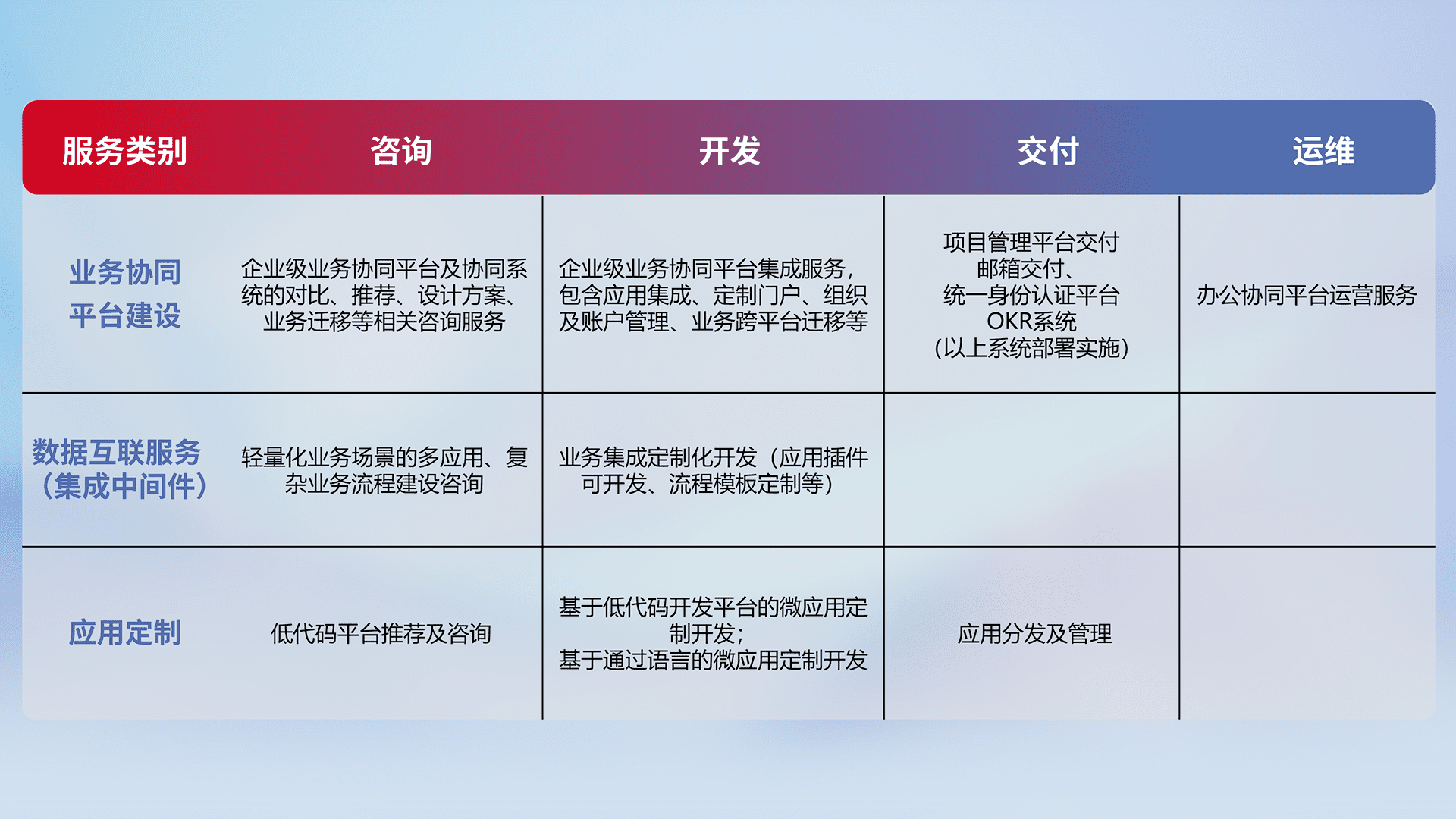 针对钉钉、、企微、、IDaas等平台级产品提供产品的规划、、、方案、、、交付、、、定制化开发等服务,,实现如统一协同办公、、、、智能客户服务、、、、混合会议管理、、、智能数据查询、、、等业务场景,,,,实现数字化转型。。。。