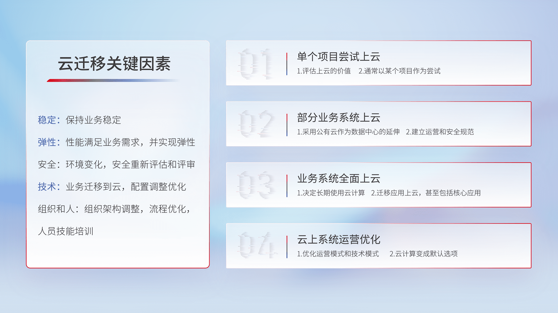 结合实际业务,,,,从规划设计、、云平台选型、、、云原生改造、、、、数据迁移、、、集成交付,,,迁移全过程为客户识别最佳上云路径,,,做好风险识别管理,,设计网络架构、、、身份权限、、、安全审计合规、、操作审计、、、、日志审计、、监控告警策略、、、多站点容灾设计等,,,,对云上基础设施进行整体规划,,,,提升IT治理水平,,,,以满足弹性、、高可用、、、、高性能的需求。。。