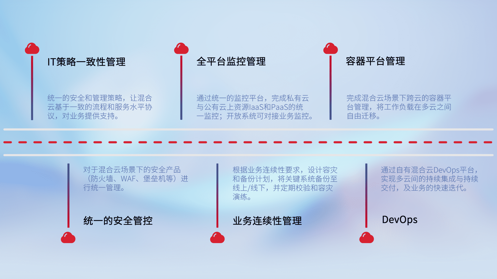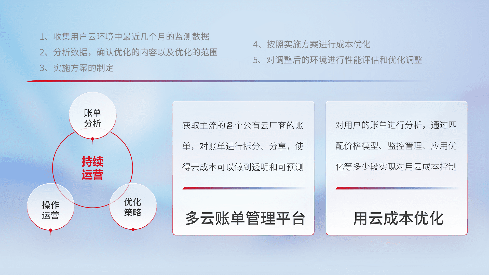 通过多云纳管,,以统一的资源数据模型把客户的云资源进行抽象和封装,,进而实现对多云资源的统一操作,,,,保障云资源管理的可靠性、、、、稳定性与可用性。。量身定制化运维内容,,配置、、、、开发运维、、、补丁管理、、、、备份、、监控、、认证和访问管理、、、审计和日常巡检等,,,,保障在用云过程中的可靠度,,,稳定度以及高可用率。。。。
